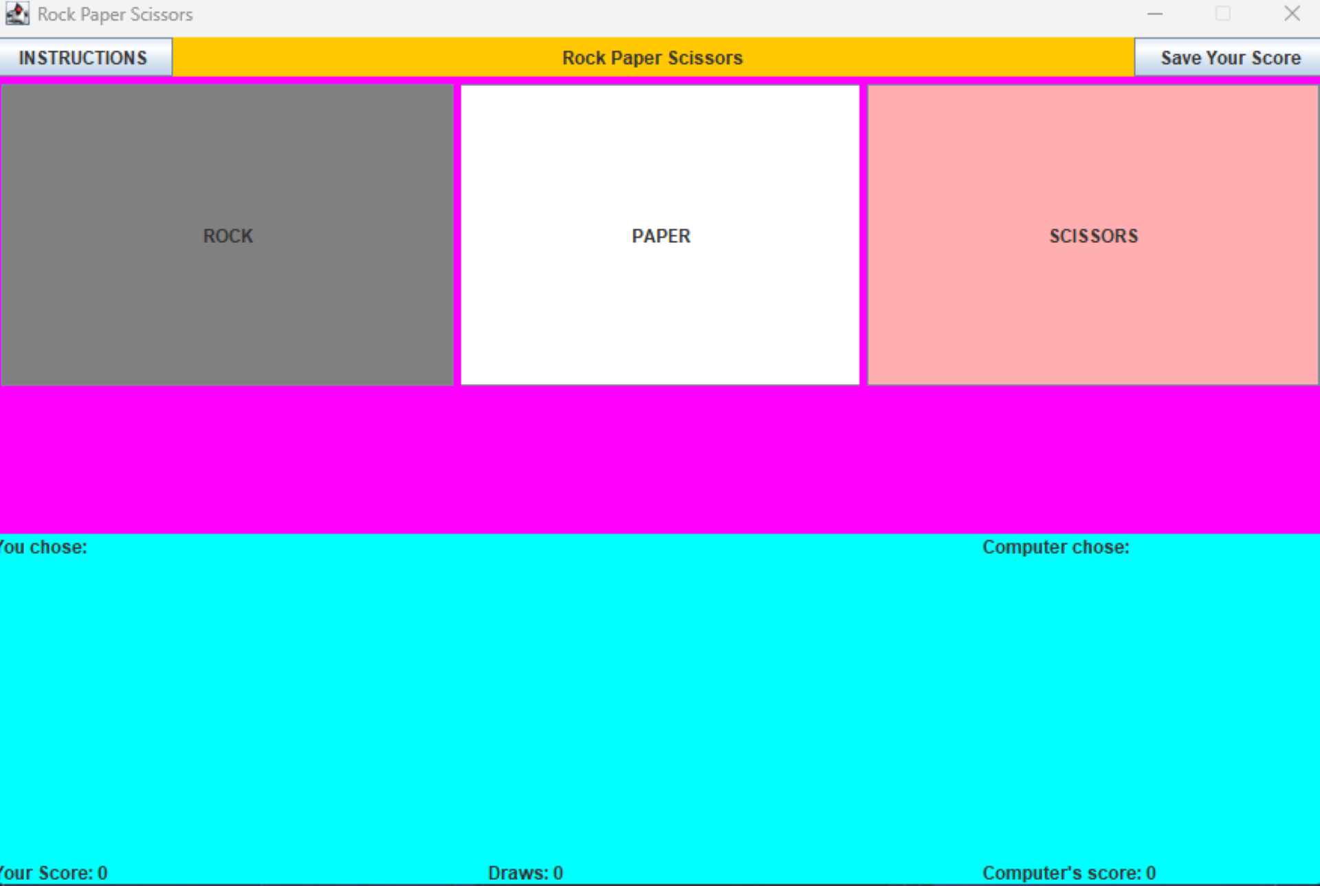 When you initially run the application you are greeted with a small window with three buttons: rock, paper and scissors, which the player can click to select. The user is playing against the computer. Each turn, the interface will state what the player chose and what the computer chose. On the top of the window, there is also an instructions and save button. As the player continues to click either rock, paper, or scissors, the application will continue to save the scores of both the player and the computer and when you click the save your score button it will save your scores into a text file.